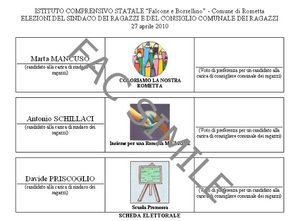 Elezione del Sindaco dei Ragazzi e del Consiglio Comunale dei ragazzi Si voterà martedi 27 aprile dalle ore 9.00 alle ore 13.00. I ragazzi di Rometta Marea voteranno nel seggio allestito presso la sede centrale dell'Istituto in Corso della libertà (Seggio n.1)mentre quelli di Rometta voteranno nel seggio allestito presso la sede della scuola primaria in via Mario Giurba (Seggio n.2). Il numero degli elettori è di 226 suddivisi: Fac simile della scheda elettorale: In allegato la guida su come votare |